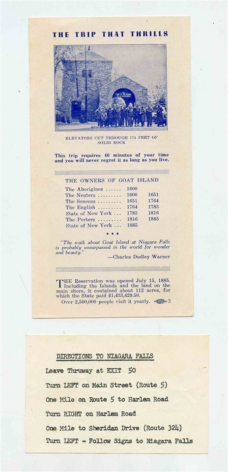 There are 2 items in this lot a 4 panel illustrated Cave of the Winds Trip Goat Island Brochure, With history of Goat Island, Niagara's Wonder Trip and more. Located in Niagara Falls, New York. Plus a small piece of paper with Driving Directions. Circa 1950's