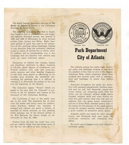 A 4 panel fold out brochure with photos and historical text. Park Department City of Atlanta Cyclorama Grant Park Brochure
