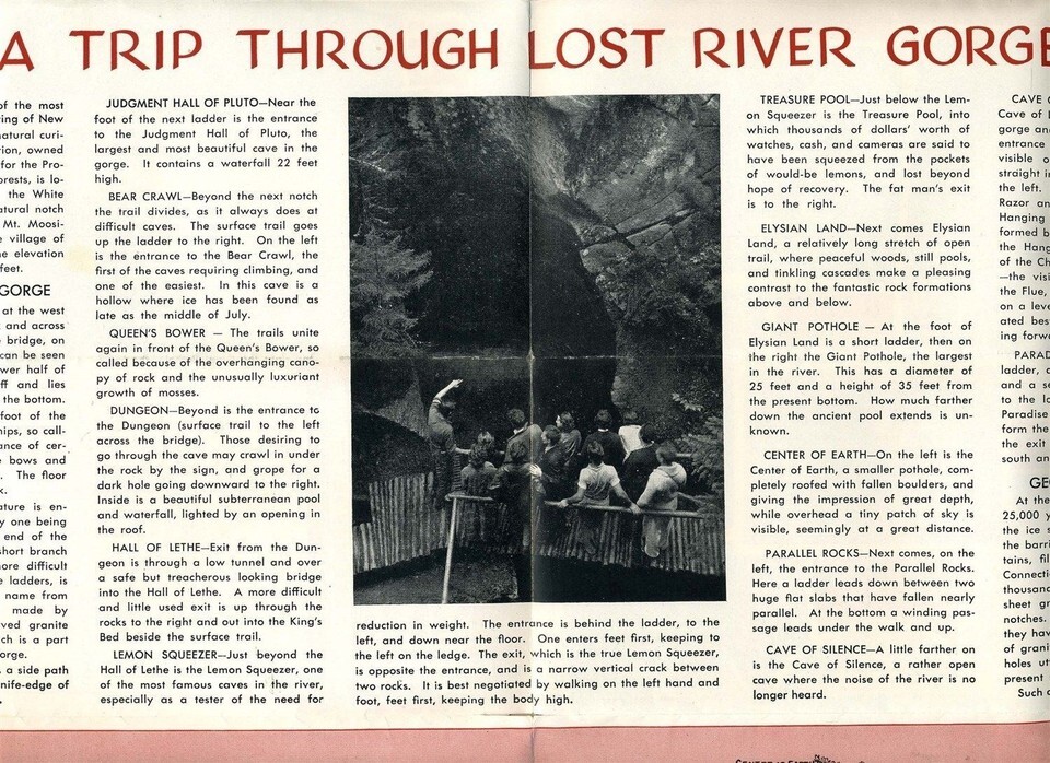A well illustrated 12 panel fold out brochure on the Lost River Glacial Caverns, Nature Garden and Paradise Falls in Kinsman Notch in North Woodstock New Hampshire. Circa 1950's. With lots of photos, a narrative and map on a Trip Through Lost River Gorge. Owned and operated by the Society for the Protection of New Hampshire Forests.
