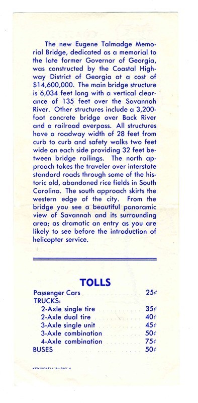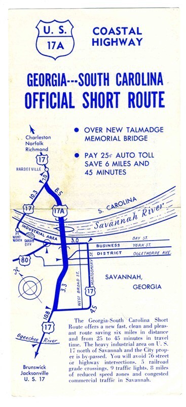 A 2 sided single page U S 17A Coastal Highway Georgia Carolina Official Short Route Brochure. With map, text, information on the new Eugene Talmadge Memorial Bridge and tolls. Circa 1950's