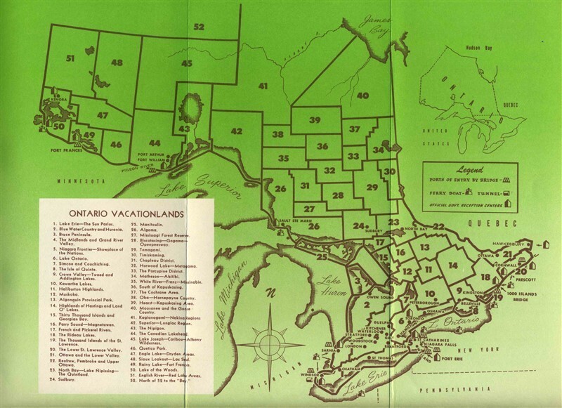 An interesting 12 panel fold out brochure, with pictures and information on Ontario Canada Outdoor activities. With Vacationlands Map and Vacation Area information, Fishing information and photos and Angling Open Seasons, Bag Limits and more. Circa early 1950's.