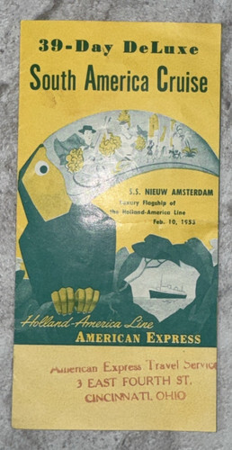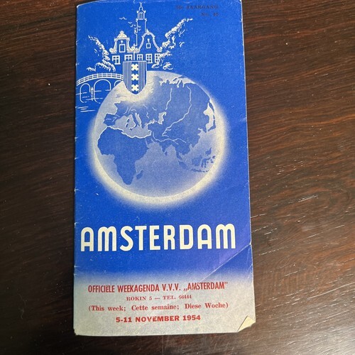 A beautiful full color 6 section fold out brochure on the Doelen Hotel in Amsterdam. In very fine condition. With Hotel drawings and hotel and area information and area map. Circa 1950's.