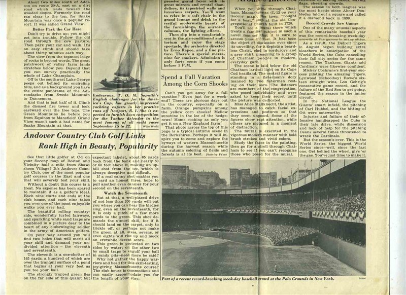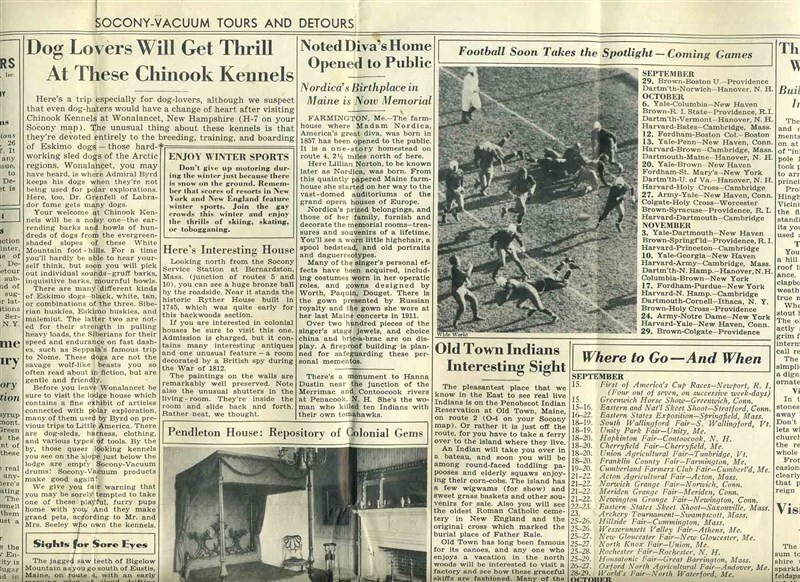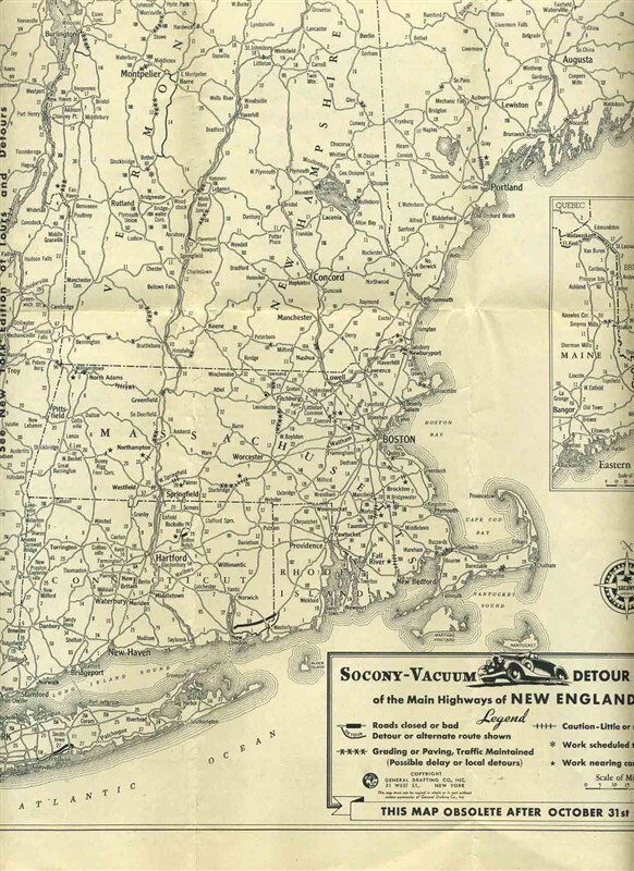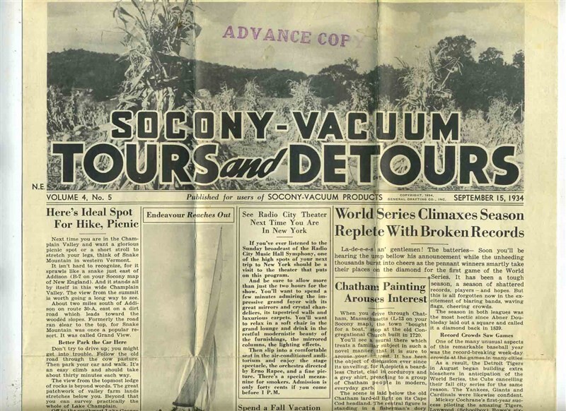 An issue of the Socony Vacuum Tours and Detours stamped Advance Copy from September 1934. Published for users of Socony Vacuum Products. Includes articles on the World Series and College Football. Has a large map of the New England States on the back cover with road closures and detours shown. 4 large pages of information and photos with schedules of area events, Vacation and site information and more. From the makers of Mobilgas and Oil.
