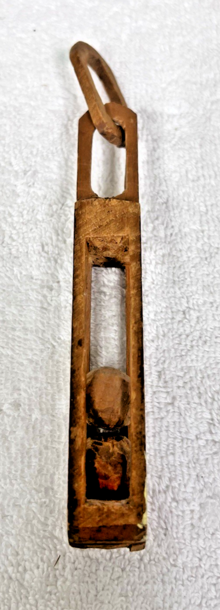 Vintage Primitive Folk Art Hand Carved 2 Chain Wood Balls Cage Whimsey Toy measures 6 1/4" long. Very nice condition folk art wood item small area on one edge with yellow paint guessing when hung on the wall. See pictures.