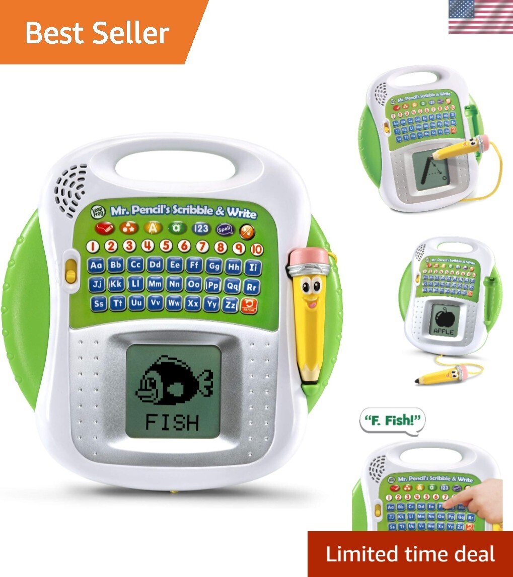 Have fun writing letters, numbers and more with Mr. Pencil?s Scribble Write! With the help of friendly Mr. Pencil, explore six activities that will introduce writing, drawing and spelling. Step by step, Mr. Pencil will show how to write numbers, shapes, uppercase letters and lowercase letters. Use the stylus on the touch screen to trace the numbers, letters and shapes and Mr. Pencil will provide instant feedback. Tap the screen to make your writing come alive with cute animations. Then get creative and use the stylus to draw anything you want! Mr. Pencil will also introduce early spelling by asking you to match letters to their sounds or to find missing letters to spell simple words. Writing is fun and interactive with Mr. Pencil!