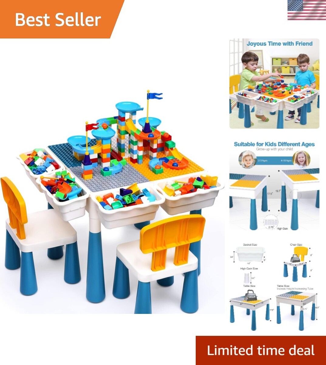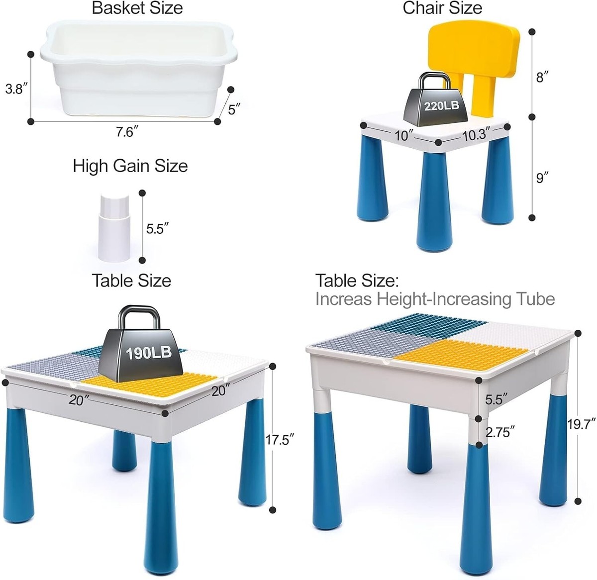Designed for Kids Growth: Building blocks table toy for 3 4 5 6 -10 s old boys, girls. We are equipped with " height increase tubes, which can be adjusted by the height of the child. Ergonomic chair design can cultivate the upright sitting posture to protects the child's spine. Toddlers activity table can accompany child to grow up, give them a happy childhood