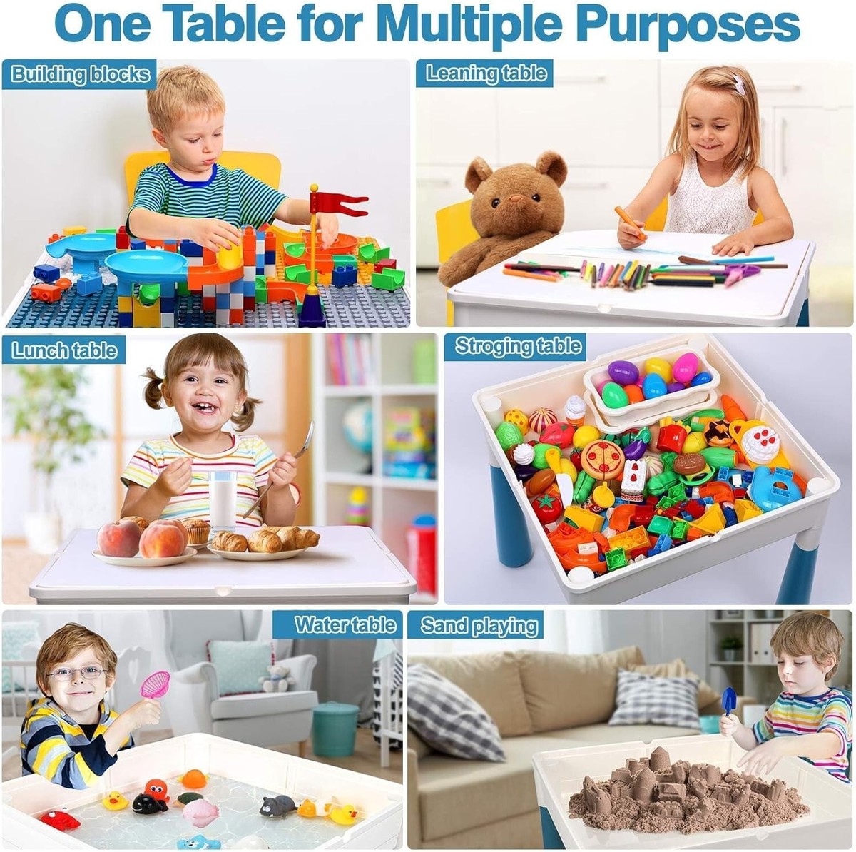 7 IN 1 Activity Table and Chairs Set: Double-sided play boards, the one is composed of four parts of the same size blocks, the other one is smooth, it can used as kids dining table, learning table, drawing table. After removing the top board, it's a storage table, water table, sand table, kids can fishing or clay handmade games. In shopping store or outdoor, multiple function activity table could keep kids entertained for hours without getting tired