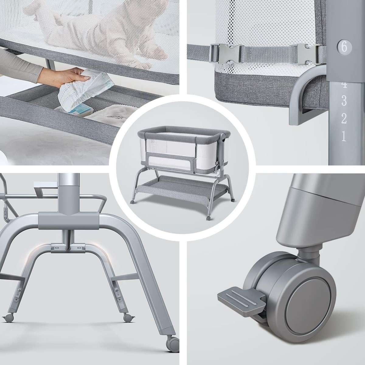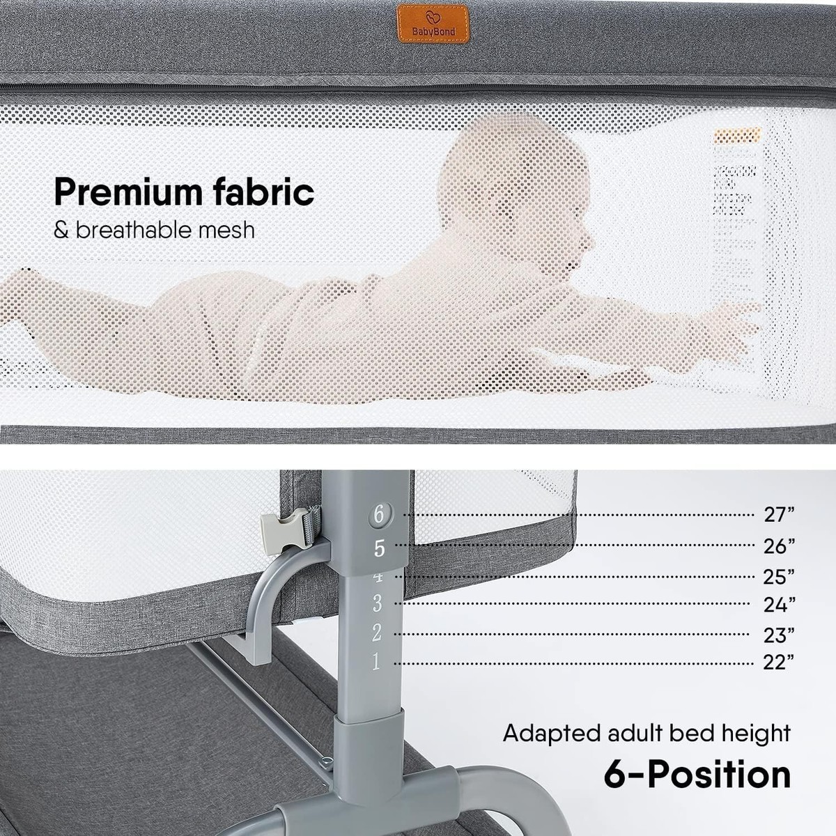 Convenient 6 Adjustable Heights: Our baby bassinet easy to adjust the gears to fit adult beds from 22 to 27 inches, making it easier for you to feed and soothe your baby at night. 3-7 adjustable angle prevents baby reflux