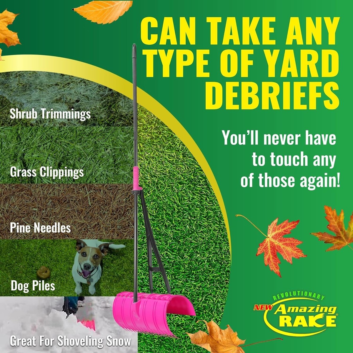 3-in-1 tool efficiently rakes, scoops, and picks up debris