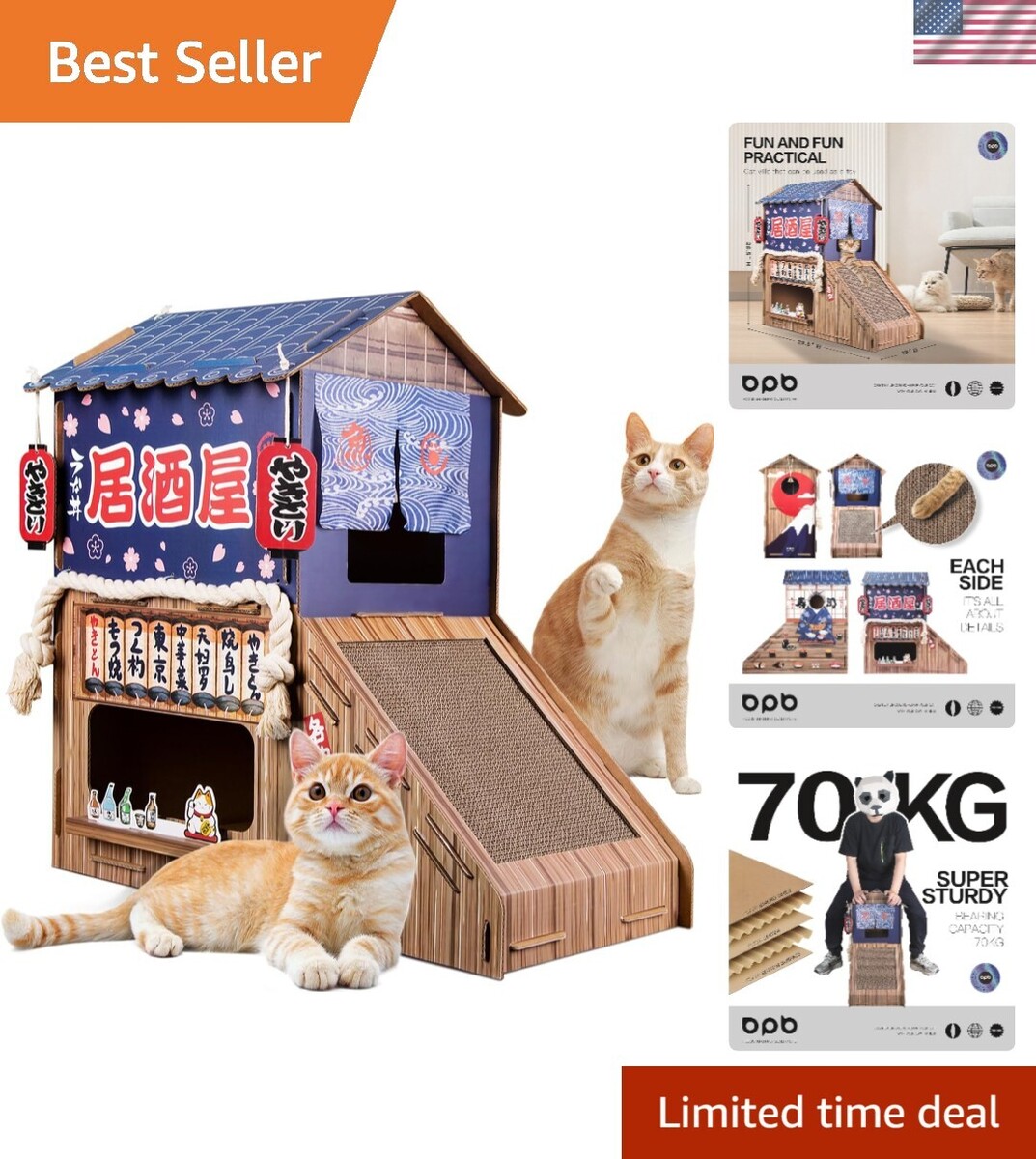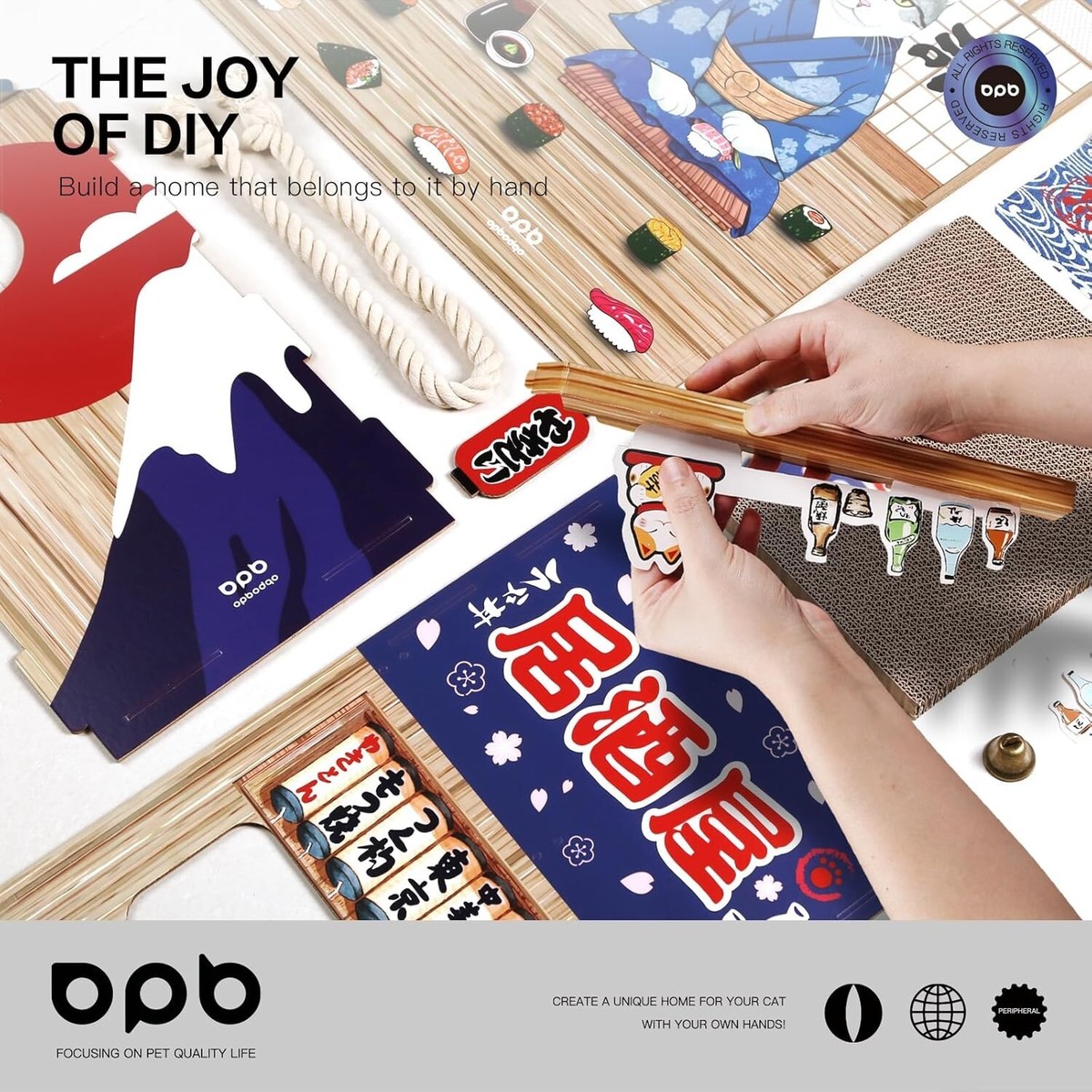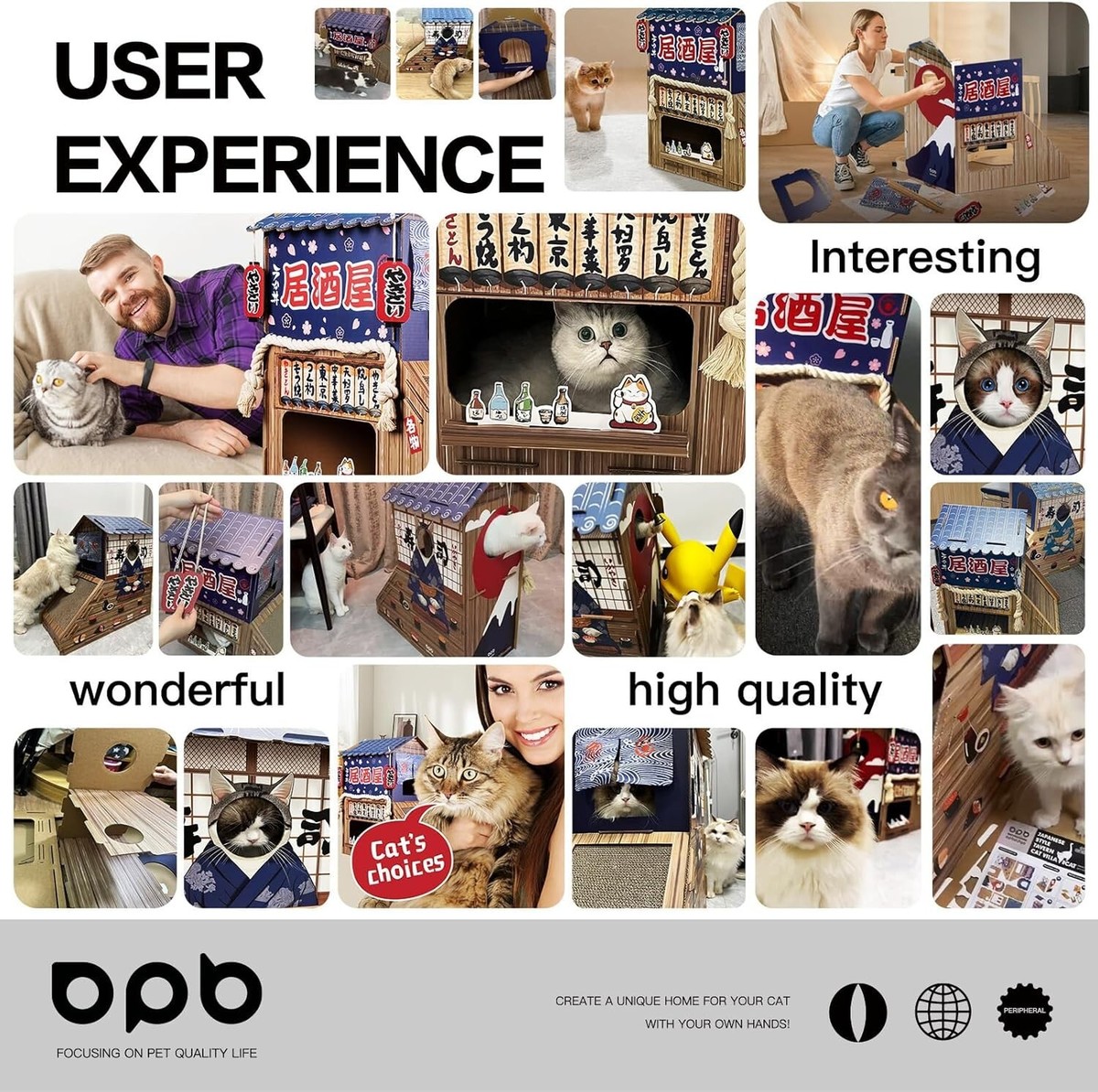 ?Features on All sides?: Front: double-story izakaya bar where cats can pretend to open a Japanese cat house tavern. Back: cat pokes out its head as if it's making sushi itself, very cute. Left: comes with a metal cat bell that makes a crisp ringing sound when cat scratches. Right side: with a sloped cat scratching board to satisfy the cat's need to sharpen its claws.