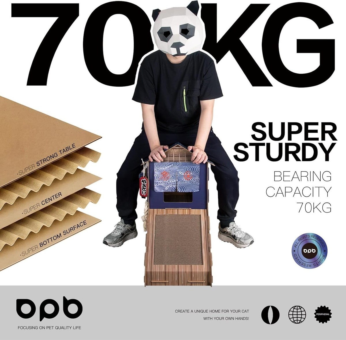 ?Sturdy cardboard cat house?Made of high-strength heavy-duty cardboard,combined with scientific construction,it can hold up to 100 pounds,so you can use it with confidence. Again: this cat cardboard house is not made of ordinary cardboard,it is very sturdy.