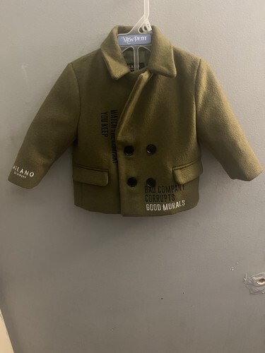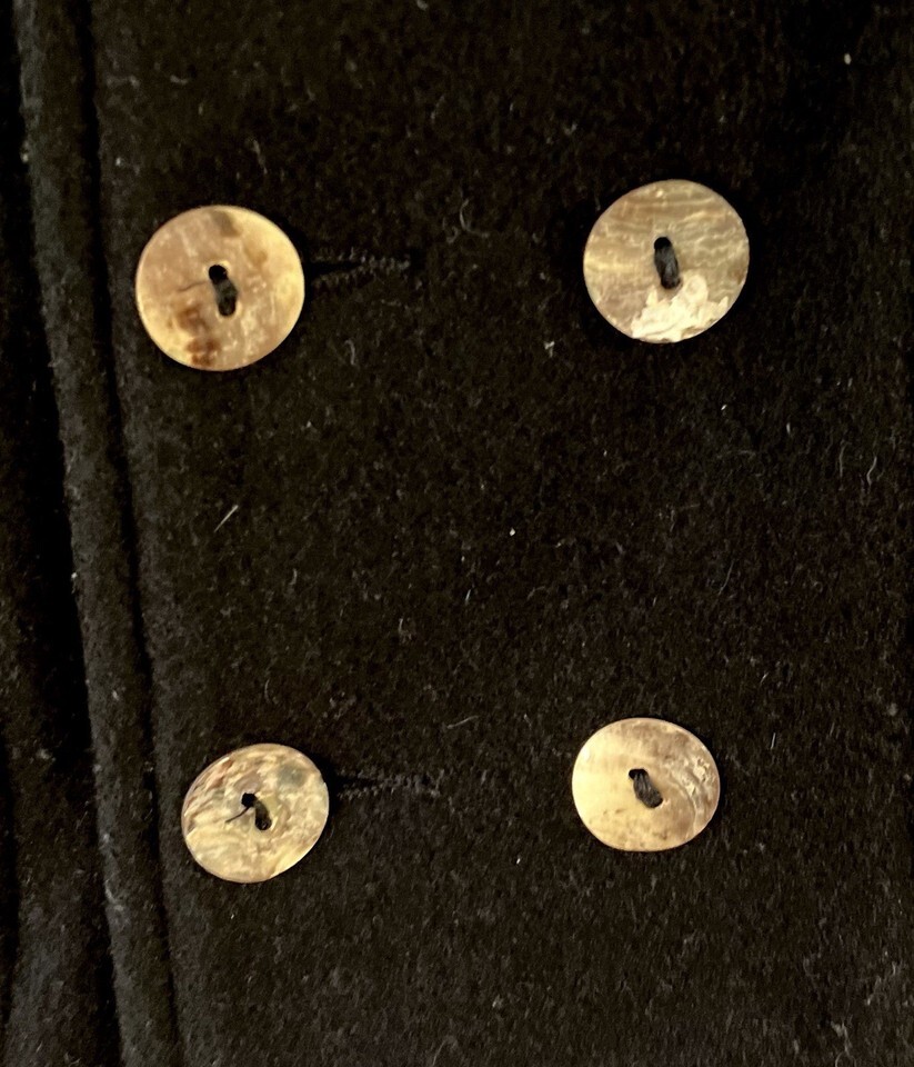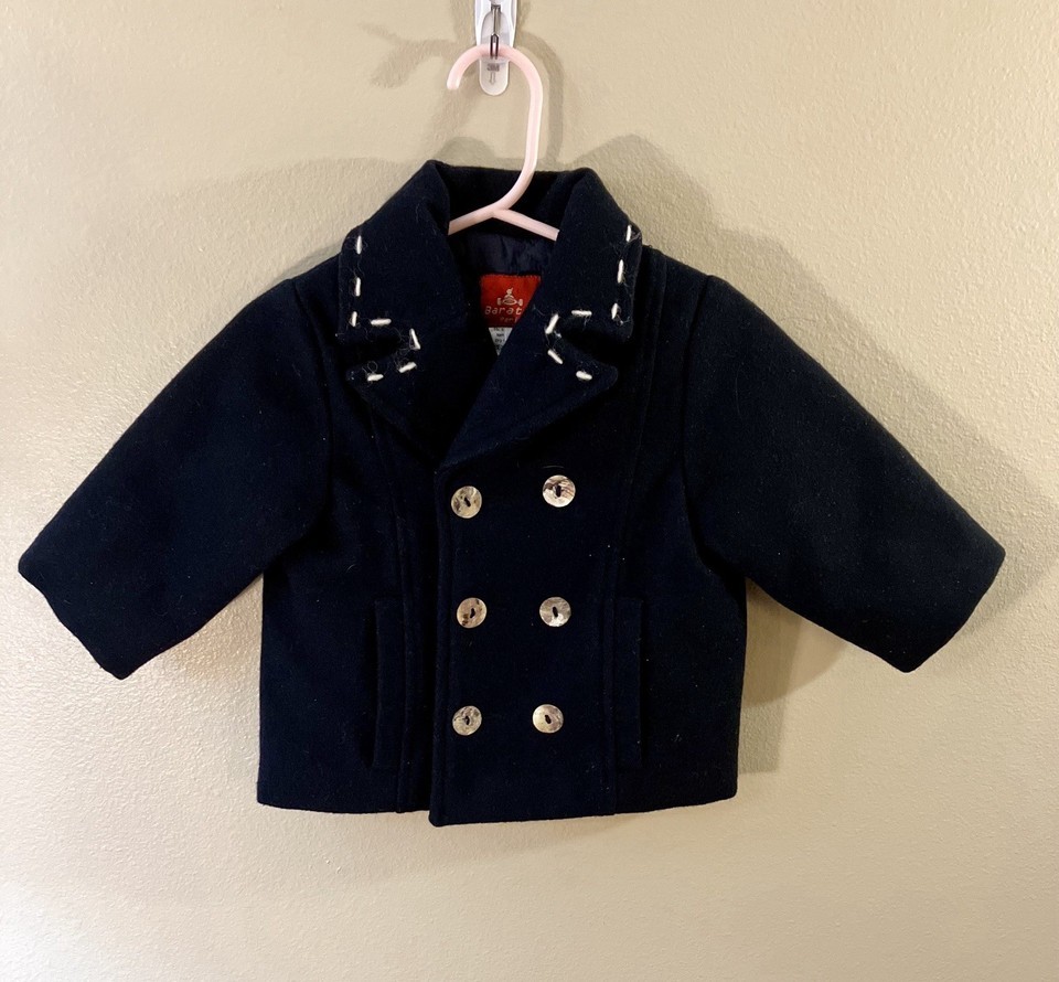 Beautiful double breasted 100% wool coat, made in France for Baratin Paris. This is fully lined with a soft quilted lining. Coat has no hood and cream stitching around collar edge. There are two front pockets on this very elegant little coat. The coat has two rows of shell-look buttons with a spare button inside.