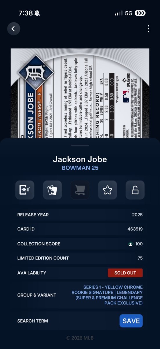 DIGITAL TOPPS BUNT Jackson Jobe - Yellow Chrome Rookie Signature /75 Legendary