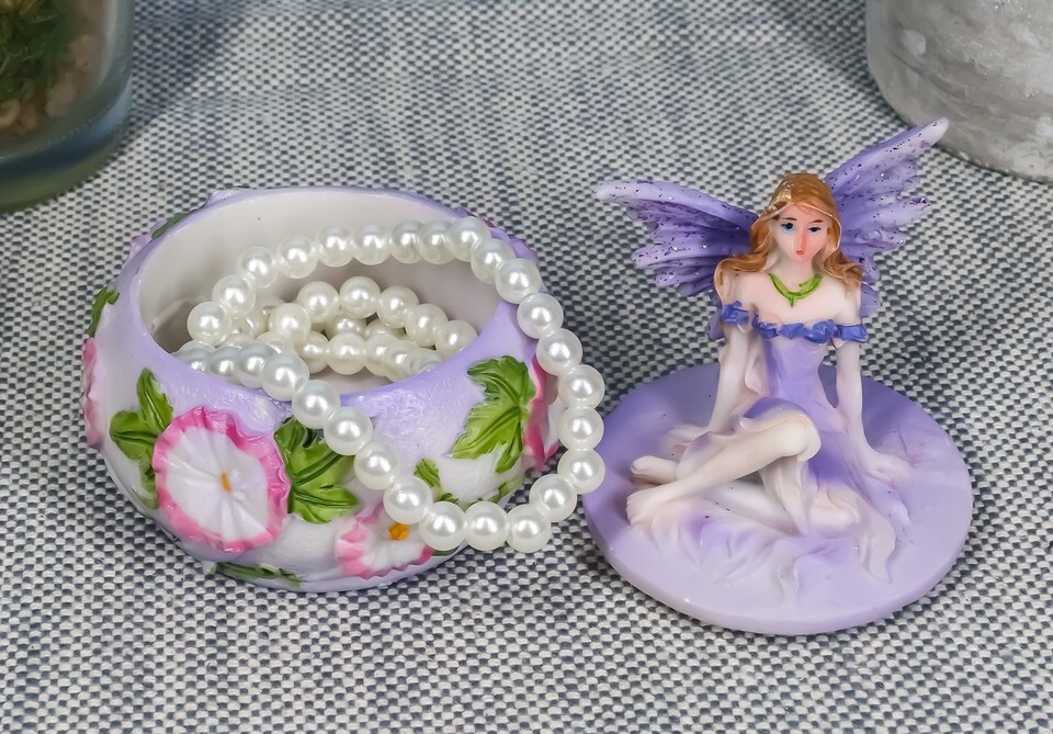 ? This Beautiful Lavender Fairy jewelry box is made of polyresin, hand painted and polished.