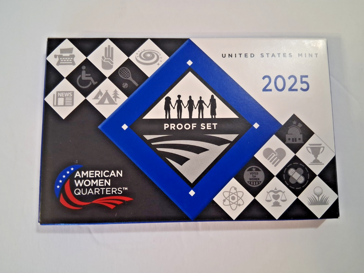 The 2025 S US Mint American Women Quarters Proof Set is a limited edition collection featuring five uncirculated coins each weighing 25 cents. Made of copper nickel, these coins are struck in proof quality at the San Francisco Mint. The set comes with a beautifully designed box and a Certificate of Authenticity from the U.S. Mint, making it a sought-after item for collectors and enthusiasts of American coins. Each coin celebrates the contributions and achievements of notable American women, added to the collection each year.