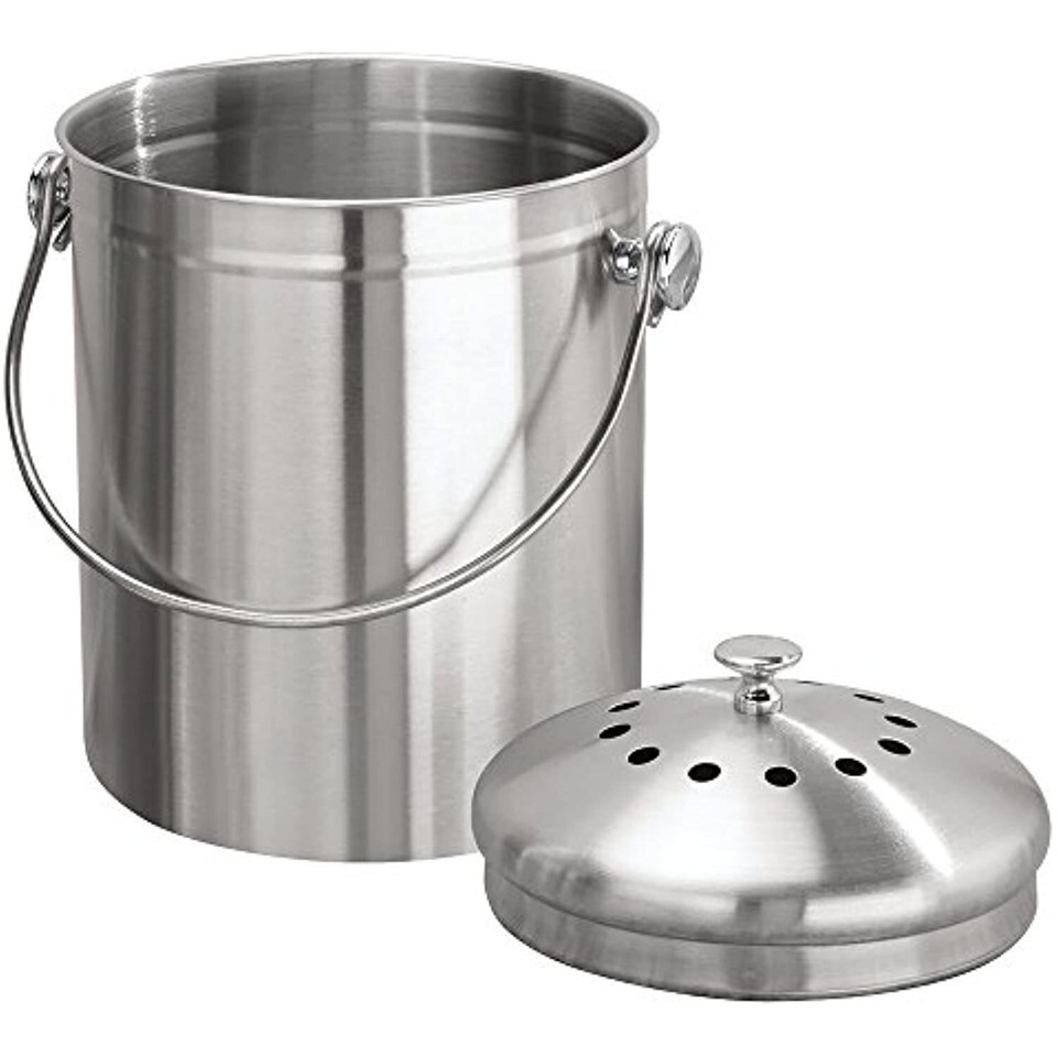Odour-Free Kitchen Compost Bin with Charcoal PhiltresWhy InterDesign? At InterDesign our sole focus set is on improving and enhancing your daily living environment. We do this through a wide range of products that bring innovation, style and organisation to your home. Each new collection is created by combining inspiration from modern trends, with practical and functional designs. Whether you are looking for an update to your kitchen, bathroom, bedroom or elsewhere, discover it within our extensive selection of products today!About the Basic series: Reliable protection and tidiness in the kitchen are ensured by these versatile home appliances from the Basic range. With their discreet design, they fit seamlessly into the kitchen and facilitate daily activities such as rinsing, drying, arranging and sorting. Household helpers you do not want to miss!Portable home compost caddy: This odour-free organic waste bin is the ideal solution for anyone looking to create their own compost at home, while still mantaining a sanitary kitchen environment. It has a generous capacity of 5 litres, allowing you and your family to collect food leftovers for a whole week. The leak-proof food waste bin is equipped with charcoal philtres, so it can be easily stored on the worktop with any odours leaking out. It's made of brushed stainless steel and comes with two philtres that should be replaced after about 4 to 6 months.Item number: 32650EU Material: Stainless SteelDimensions: 17.8 cm x 17.8 cm x 21.6 cm