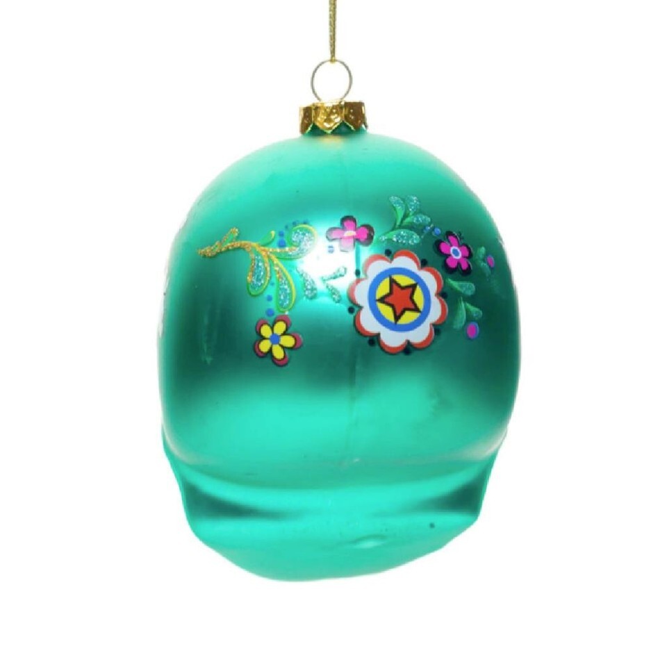 SKULL ORNAMENT 4" Glass Christmas Tree Day of the Dead Sugar Muerto Teal Green