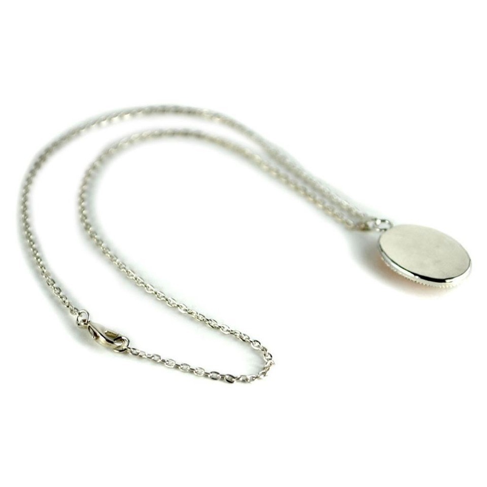 This playful necklace features a glass cabochon style charm strung on a dainty silver tone metal chain (8.5" hang) with clasp.