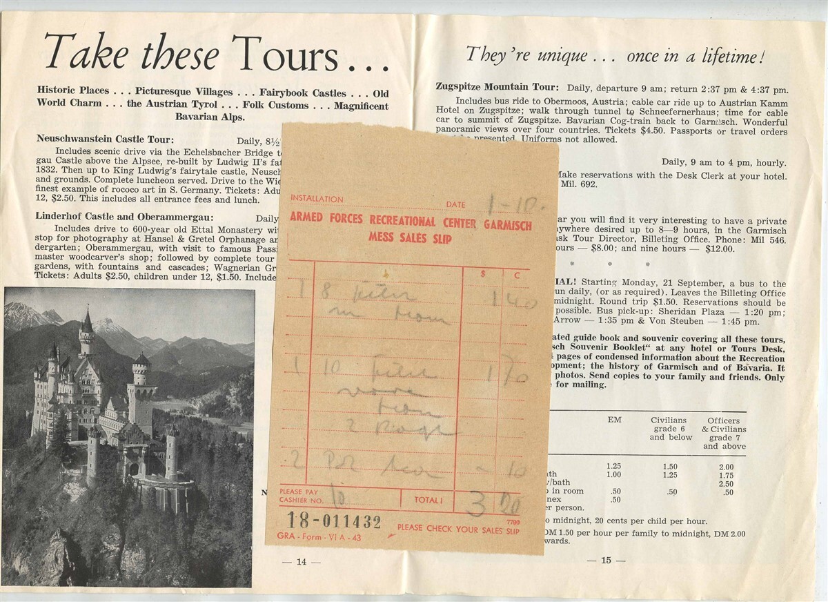 Garmisch Activities Booklet & Mess Sales Slip US Army Recreation Area 1959