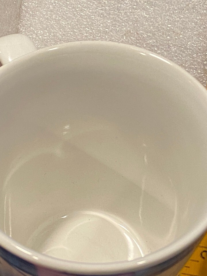 The coffee mug is listed as pre-owned but it is from display. It was never used for drinking. It is clean with no wear, chips or scratches.