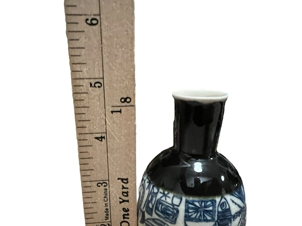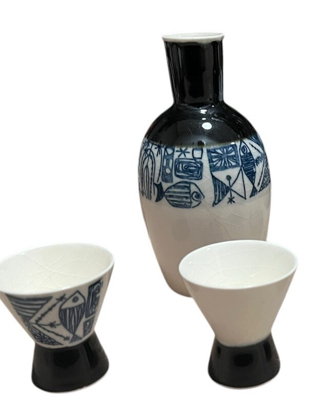 Vintage Japanese Kutani Ware Pottery Sake Tea Cup Bottle Set Blue White Signed