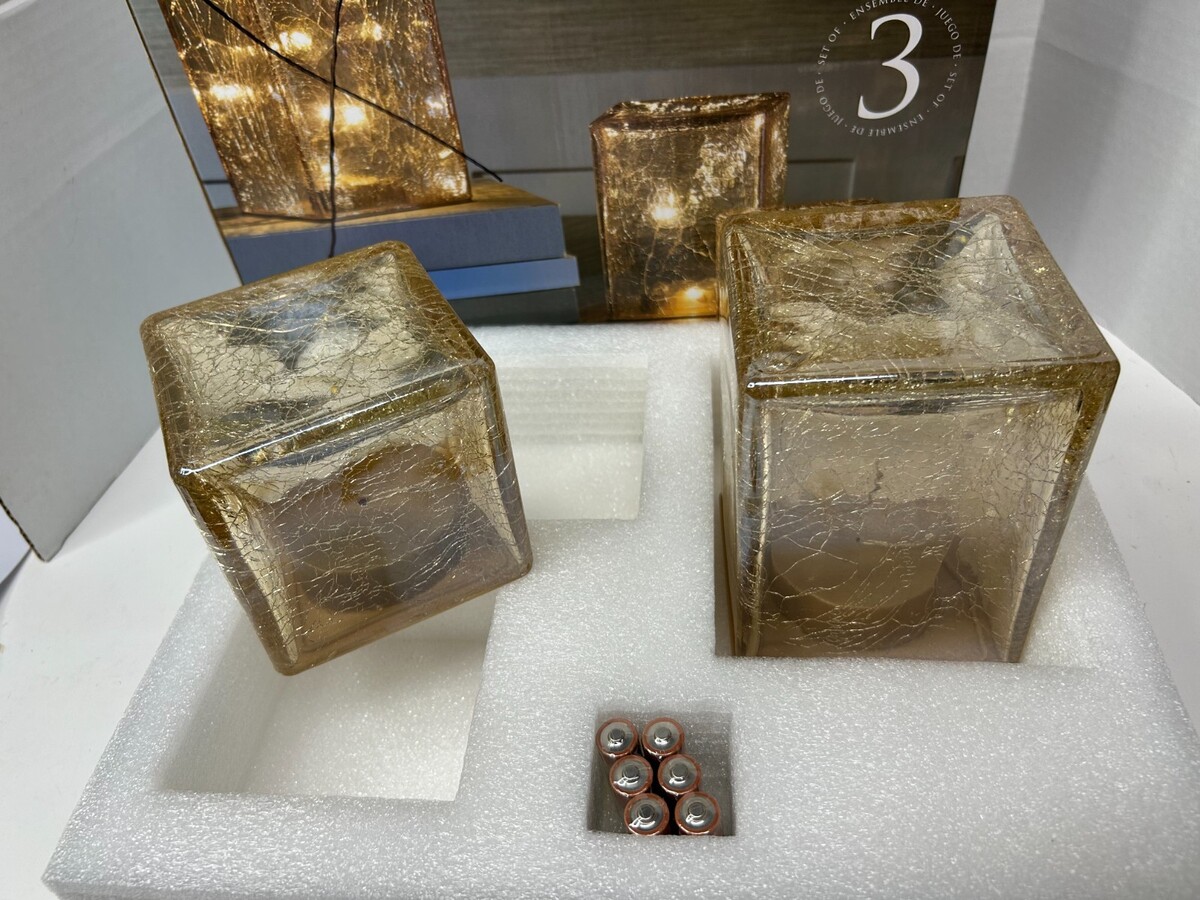 Evergreen 2-piece Hand-Blown LED Glass Cube Towers, Gold Crackle Finish - Decor