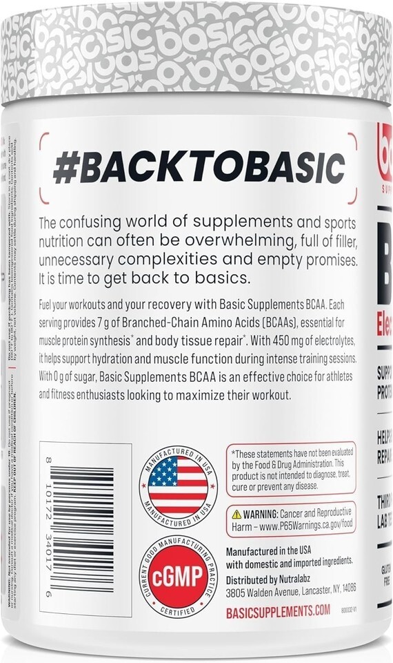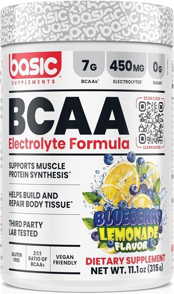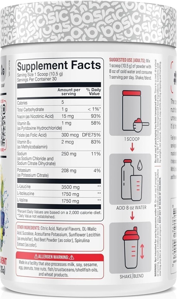 Fuel your workouts and your recovery with Basic Supplements BCAA. Each serving provides 7 g of Branched-Chain Amino Acids (BCAAs), essential for muscle protein synthesis* and body tissue repair*. With 450 mg of electrolytes, it helps support hydration and muscle function during intense training sessions. With 0 g of sugar, Basic Supplements BCAA is an effective choice for athletes and fitness enthusiasts looking to maximize their workout.