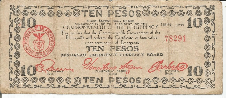 Philippines WWII Mindanao 10 pesos P-S488 1944 CIR. Banknote # 129