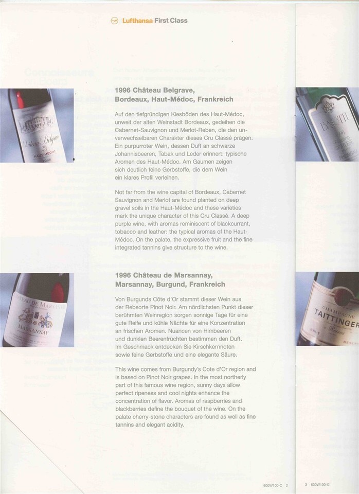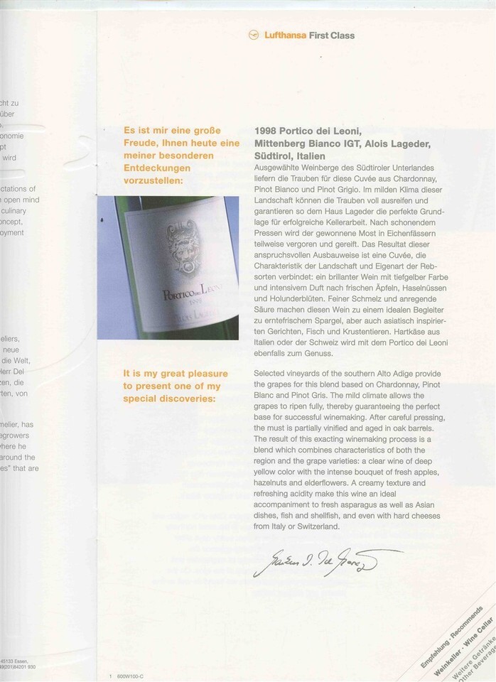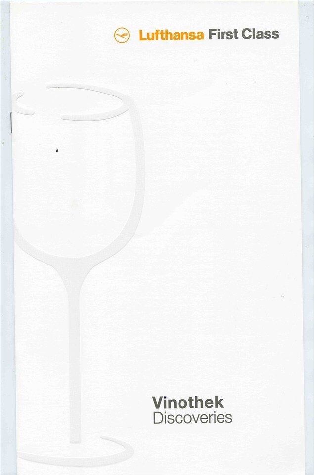Plus a 12 page illustrated Lufthansa First Class Vinotek Discoveries Wine List with information on the selected Lufthansa wines and specifically on Wine suggested by Markus Del Monego. All in very fine condition
