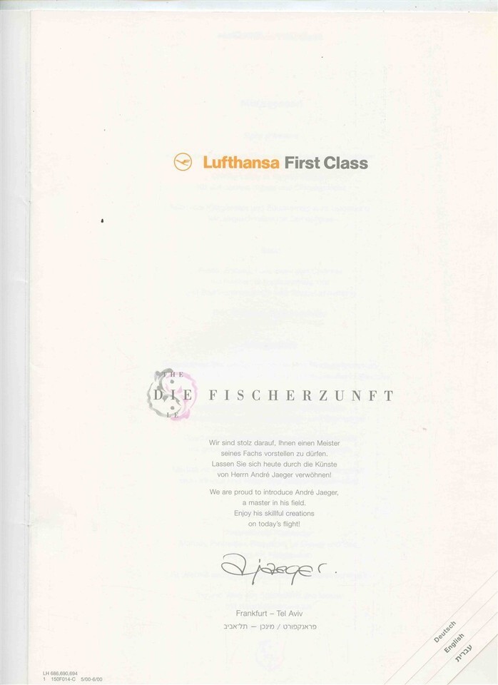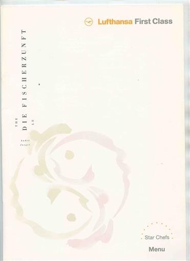 There are 3 items in this lot. A 12 page First Class Menu from a Lufthansa flight from Frankfurt to Tel Aviv in 2000. In English , Hebrew and German. With information on Chef Andre Jaeger and Die Fischerzunft. This menu measures about 8 1/4" x 11 3/4" when closed. Laid into this menu is a colorful 2 sided page in German and English on the Star Chefs, with recipes.
