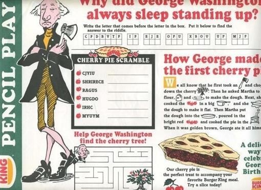 Burger King Placemat George Washington 1988 Cherry Pie Pencil Play
