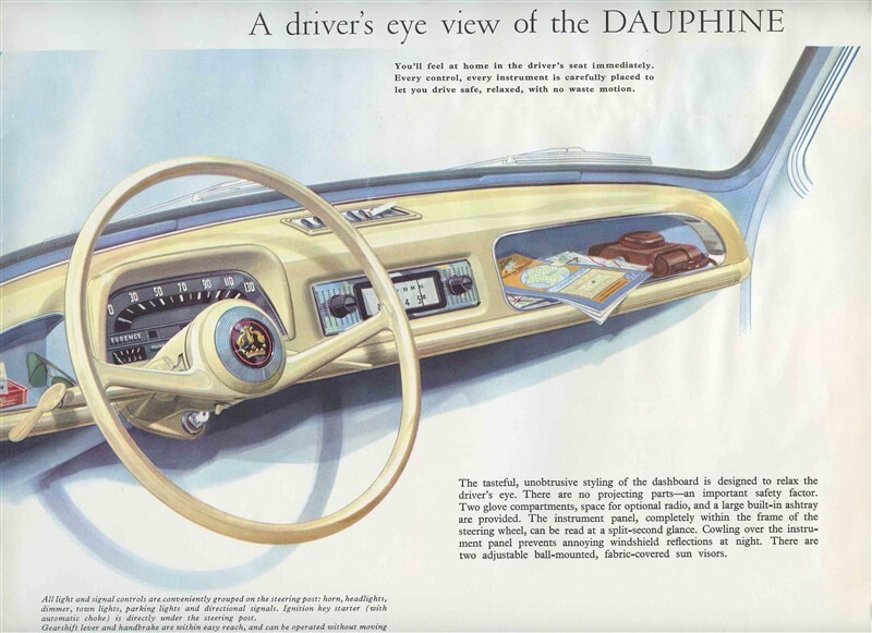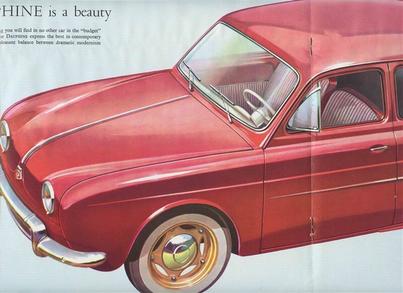 A large 16 page 1956 Renault Dauphine Sales Brochure . With photos of interiors and exteriors. information. on features and specifications and Ventoux Engine and more. Pictures of the Renault Dauphine on the road in Countries all over Europe. Measures about 11 7/8" x 9 3/4" when closed.