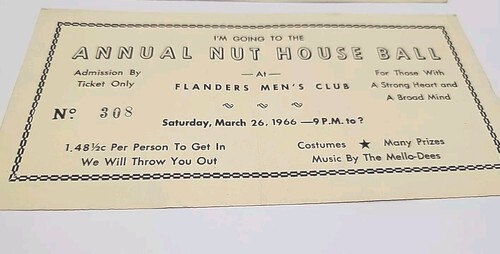 This vintage 1966 Flanders Men's Club Annual Nuthouse Ball Ticket Stationary is a must-have for collectors of historical memorabilia. The ticket stationary is a unique piece that captures the essence of the Flanders Men's Club and the Nuthouse Ball event. It features the year 1966, and is not signed.