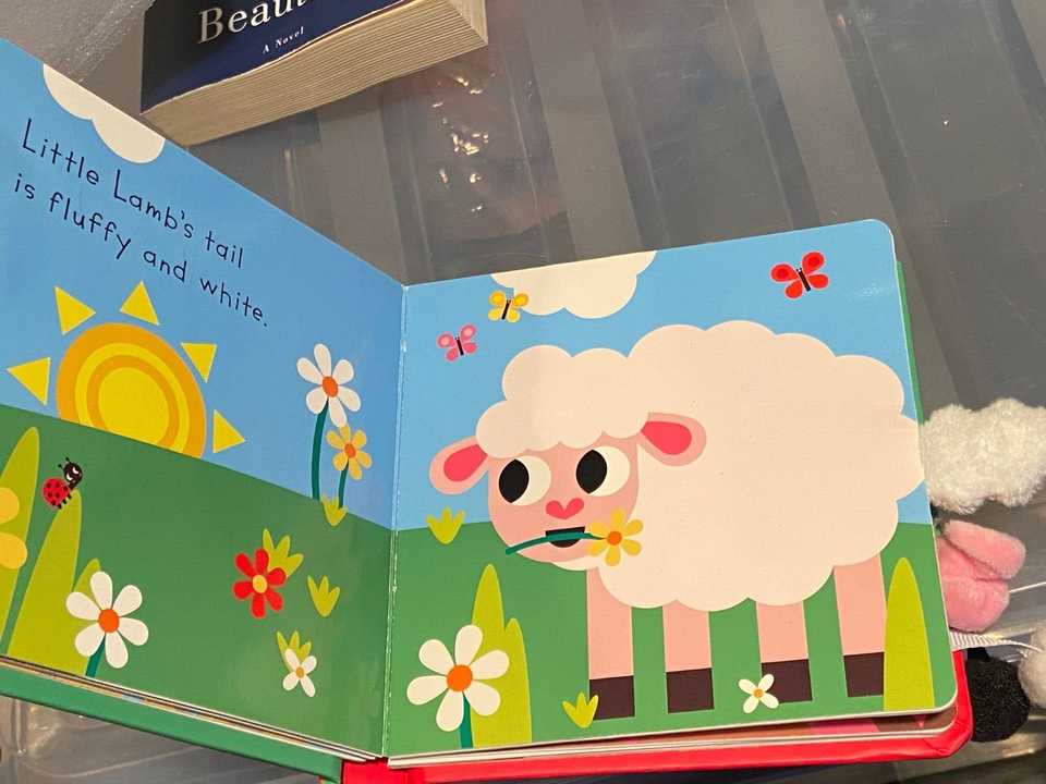 The board book is small and 4 pages . They show the tails of the animals sticking out the side of the book with soft pom poms and felt.