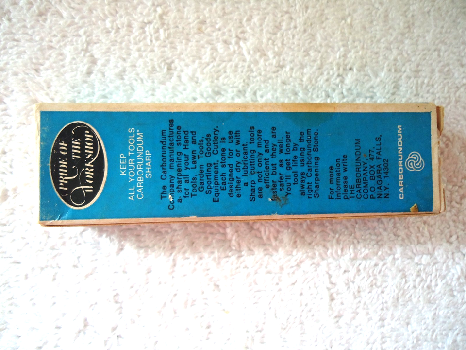 Here is a " NOS " Pride Of the Work Shop Carborundum Coarse Sharpening Stone " IOB ".This is a must for any collector,or decorator wanting that vintage retro look. If you have any concerns or questions about this item(s) please ask before bidding / purchasing because this item(s) is being SOLD AS IS.Thank You.-(PC22)