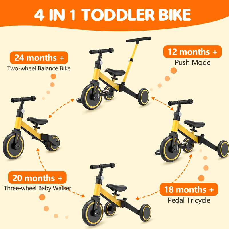 4 in 1 Toddler Bike, Kids Tricycle for 1-5 Years Old, Toddler Tricycle for Boy Girl, Baby Balance Bike with Parent Steering Push Handle, Removable Pedal, Adjustable Seat Yellow