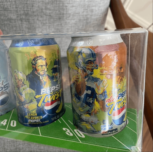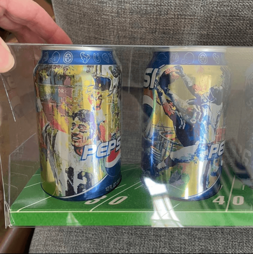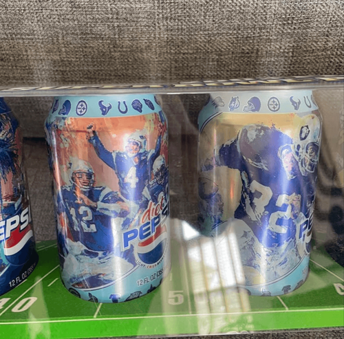 New and sealed in package, Pepsi, 2003 Super Bowl party cans. Includes two Pepsi, two diet Pepsi, and two Pepsi twist cans- one reg and one diet with super bowl decoration, and in a clear yard line plastic case. Buccaneers versus Raiders. 20? x 5? x 3.5?