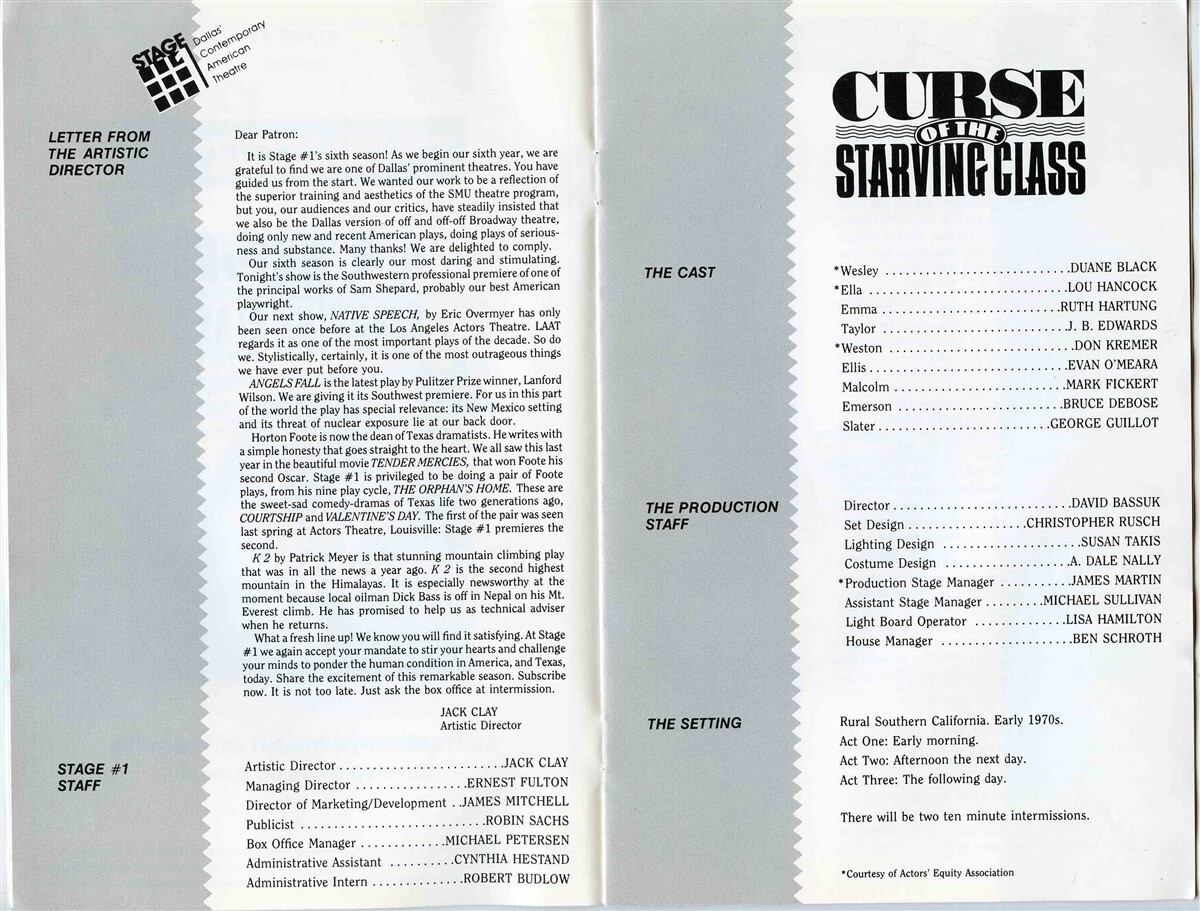 From Stage One in Dallas Texas. Sam Shepard's Curse of the Starving Class SW Regional Premiere Program