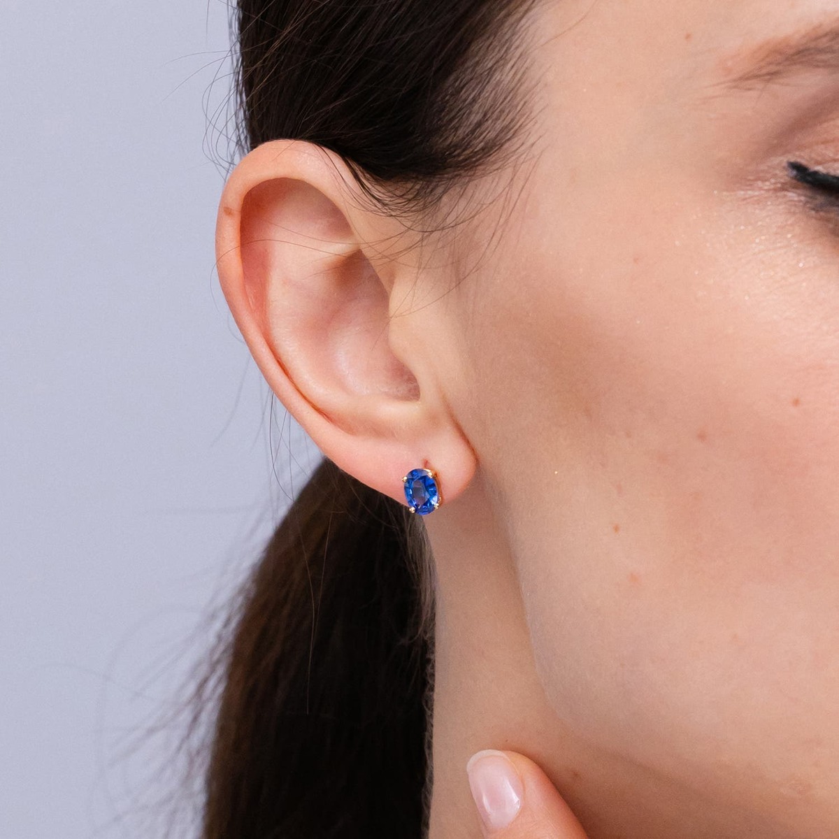 This pair of solitaire sapphire stud earrings crafted in 14k solid gold is simple yet stunning. The oval sapphire sits in a prong setting and captivates with its magnetic blue hue.