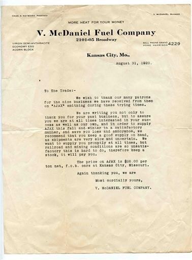V. McDaniel Fuel Company Kansas City MO Letter 1920 AJAX Coal