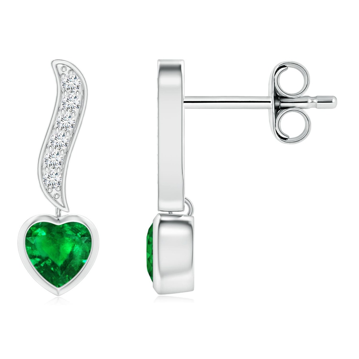 These silver heart-shaped emerald earrings exude feminine charm. Suspended from diamond-studded swirl motifs, the bezel-set beaming greenish gems look simply stunning.