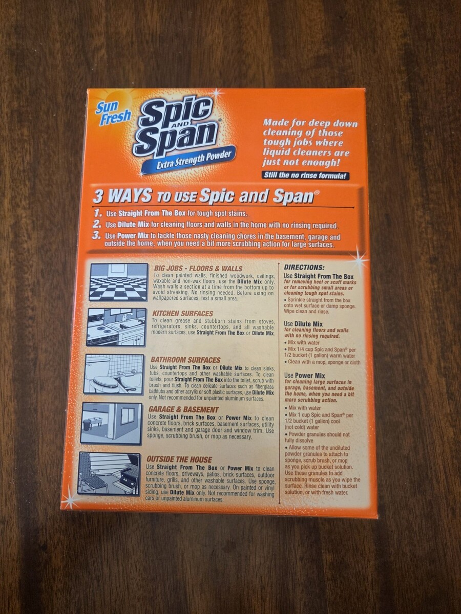 The Spic and Span Extra Strength Powder is a heavyweight cleaning solution designed for the kitchen. This all-purpose powder cleans effectively and is perfect for scrubbing tough surfaces. Made in the United States, each box contains 27 oz of powder, providing 7 gallons of cleaning capacity. With a fresh scent and multifunctional features, this product is a convenient and effective choice for keeping your home clean and spot-free.