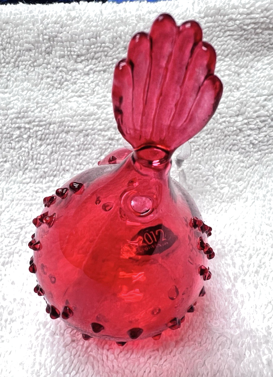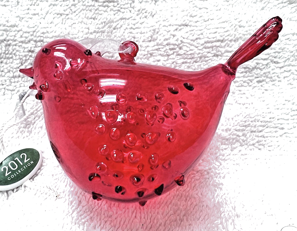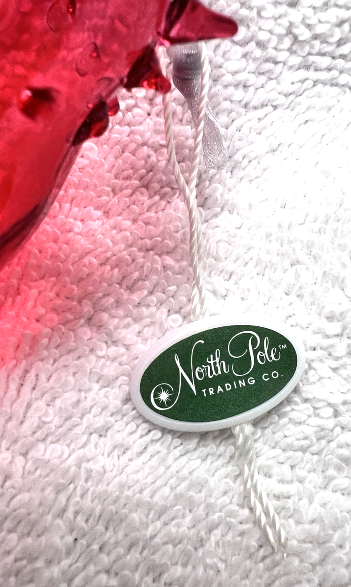 North Pole Trading Co Hand Blown Red Glass Bird Christmas Ornament 2012 Tag measures approx. 4 1/2" long. Glass ornament in like new condition with no damage and original tag attached. See pictures.