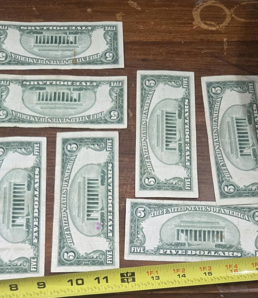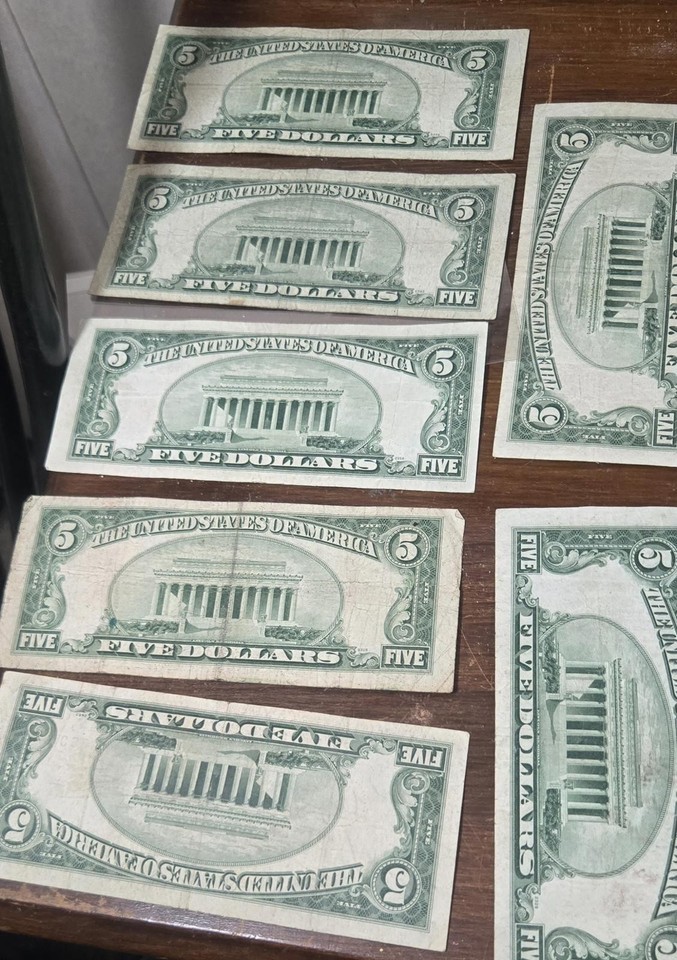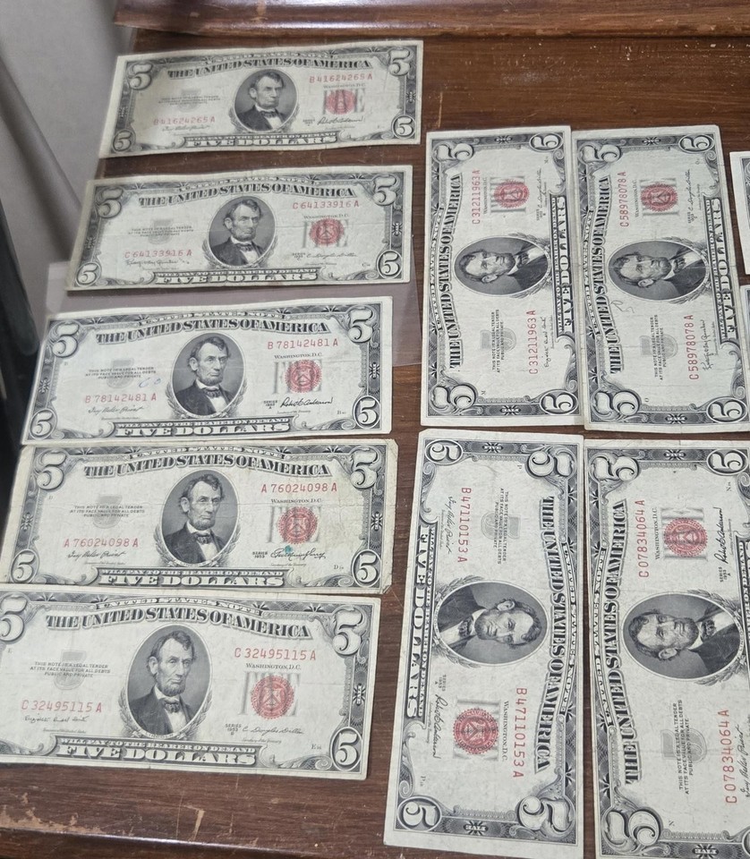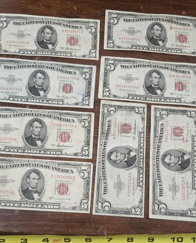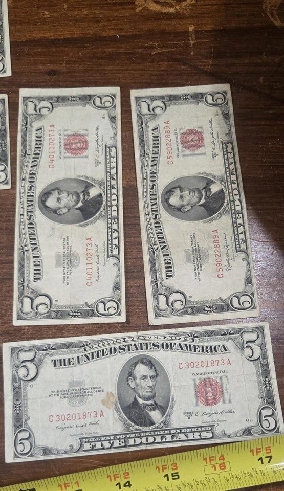A collection of vintage United States $5 Red Seal Silver Certificates.