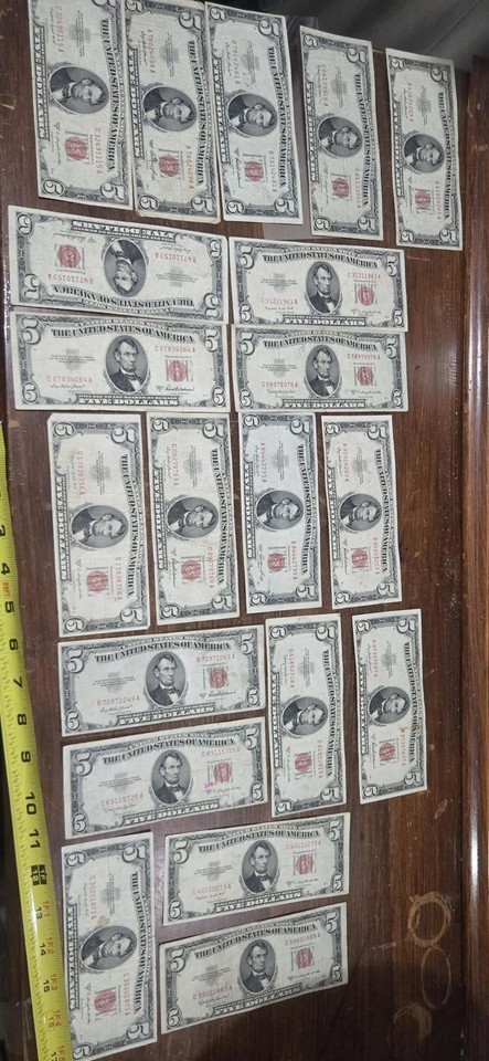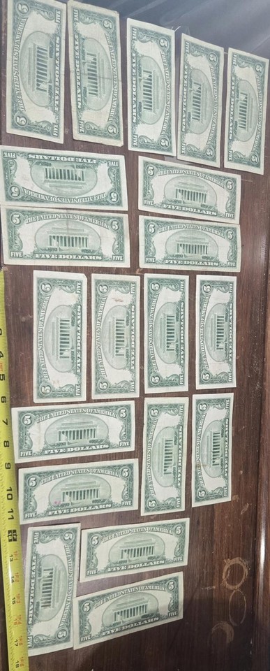 20x Vintage All 1953 United States $5 Red Seal Silver Certificates Paper