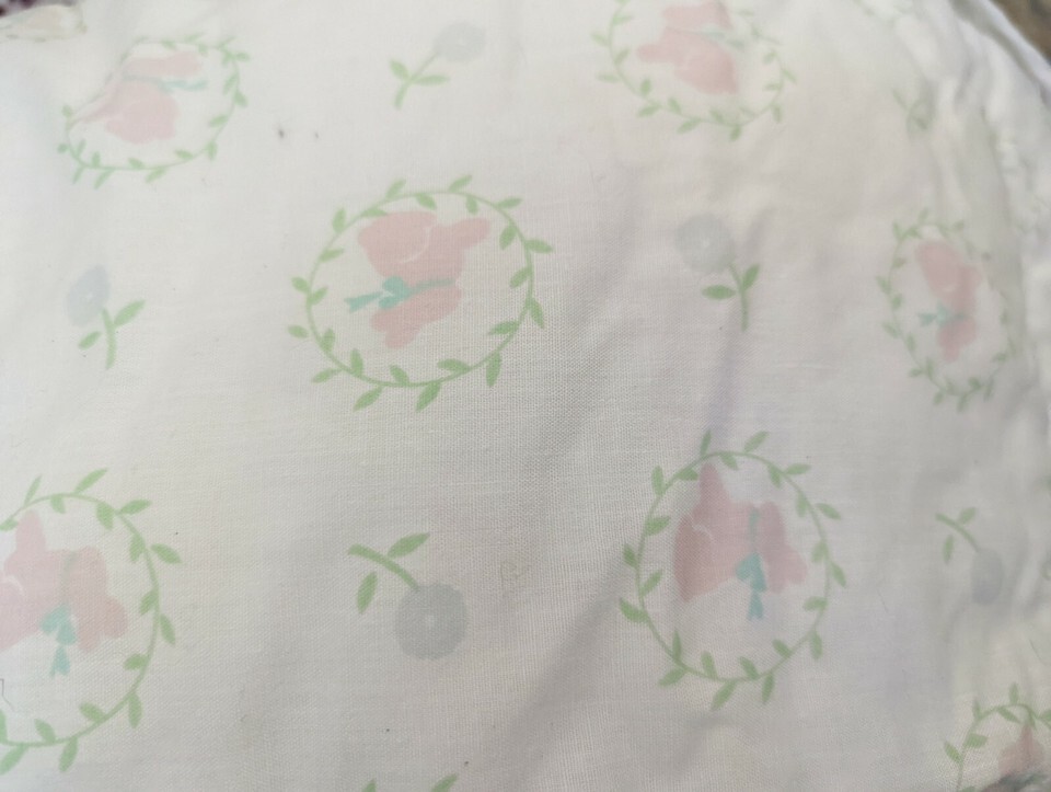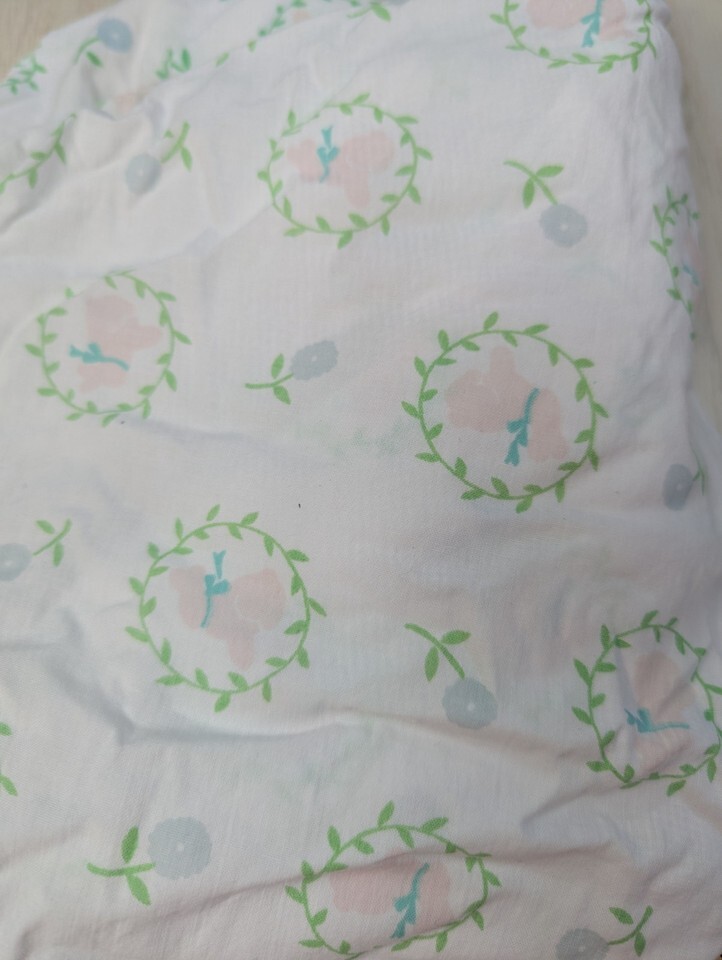 Vintage pink bunnies blue flowers crib sheet Kathy Orr designs ELASTIC STRETCHED
