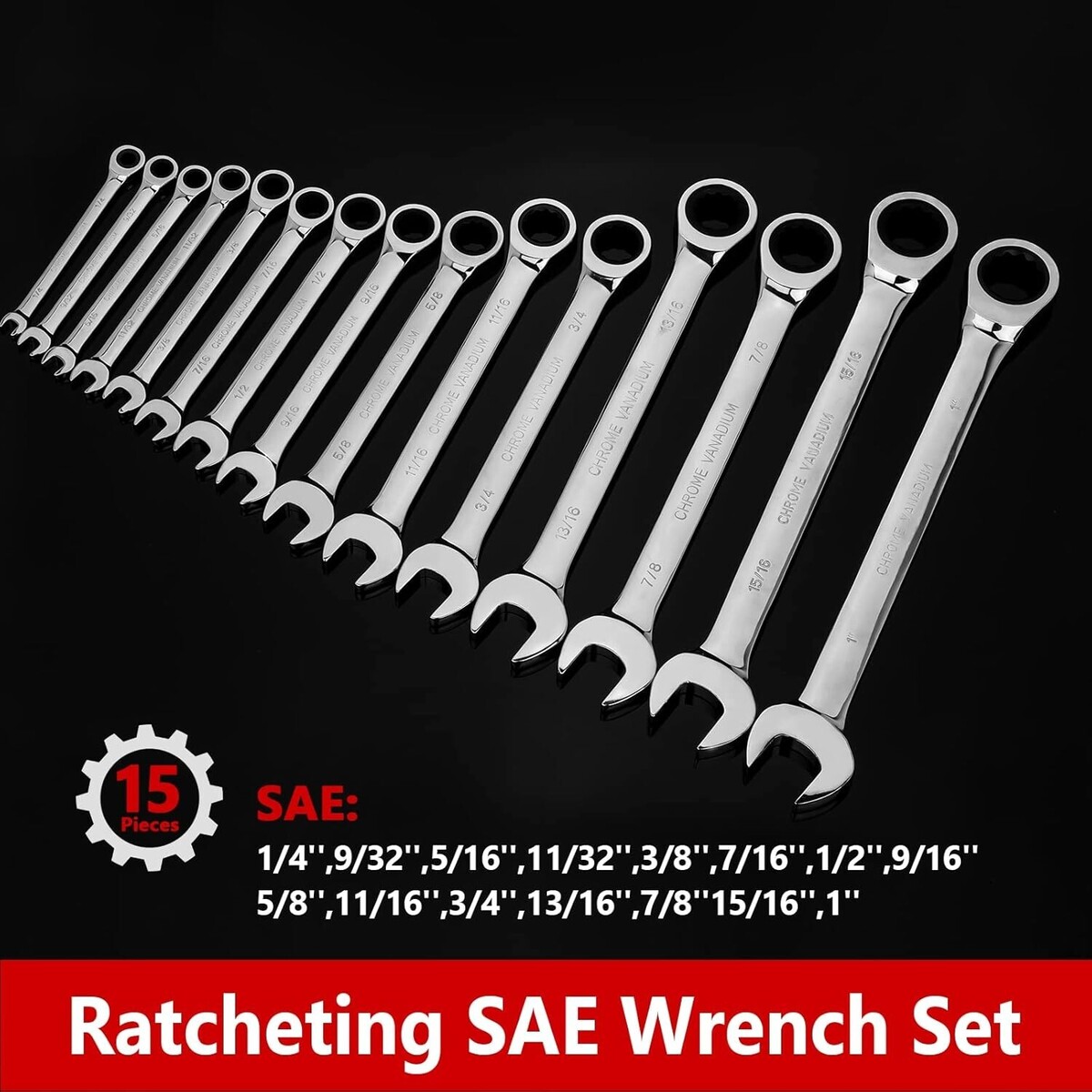 15 PIECES RATCHETING WRENCH SET: Includes 15 SAE wrenches: 1/4'',9/32'',5/16'',11/32'',3/8'',7/16'',1/2'',9/16'',5/8'',11/16'',3/4'',13/16'',7/8'',15/16'',1''. A wide variety size of tools for the best meets your need.