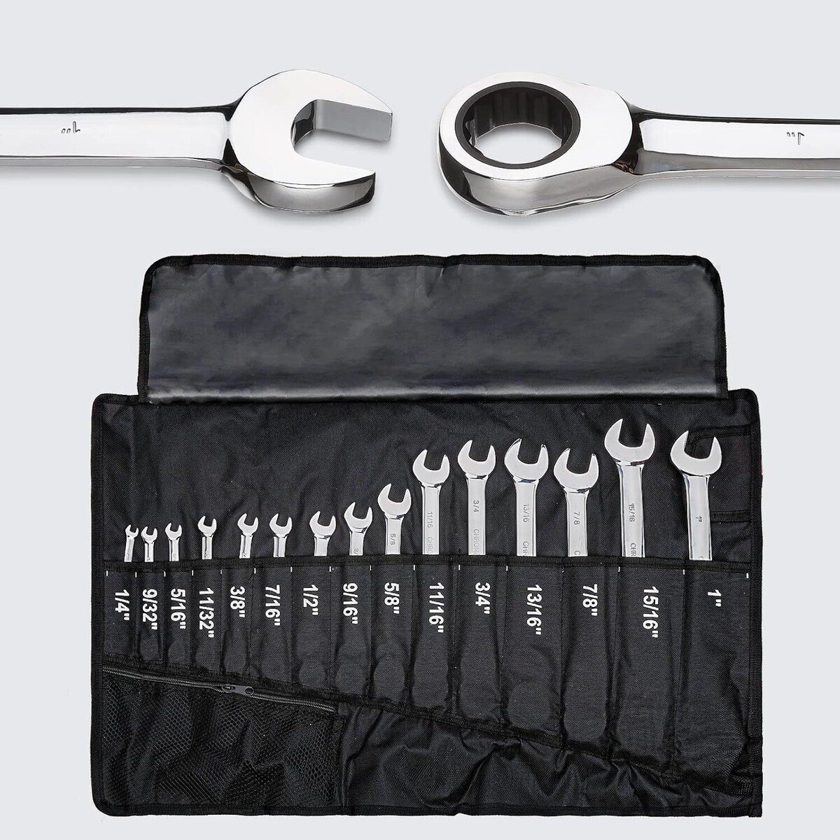 15-piece SAE Ratcheting Wrench Set, SAE 1/4" to 1" Chrome Vanadium Steel, 12-Point, 72-Teeth Open End and Box End Combination Tool with a Roll Up Storage Bag