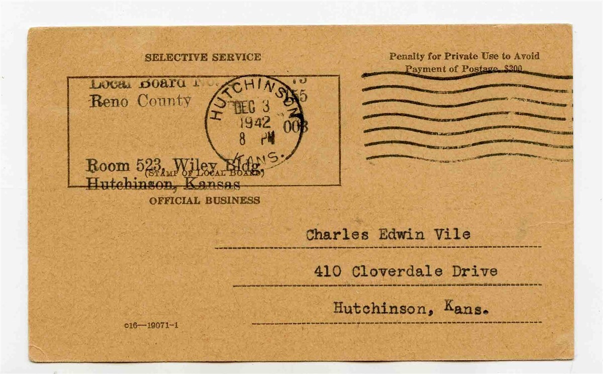 A 2 sided postcard . Selective Service 1942 Notice to Registrant to Appear for Physical Examination