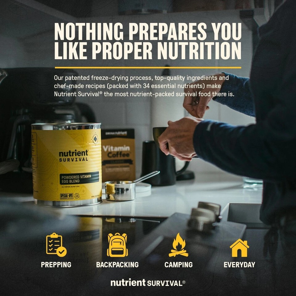 In times of stress, the mind and body can fail. That?s why you need Nutrient Survival. Delicious, chef-made recipes packed and patented with the same level of elite nutrition that?s required for Special Ops forces, to help you stay strong, alert, and satisfied when you need it most. Made with real ingredients. Made in America. To keep you healthy, strong and alert. Sealed tight in durable #10 cans with a shelf-life of up to 25 years. Ideal for family adventures, emergencies, enjoying life off the grid, everyday wellness and optimal performance. It?s preparedness through nutrition. Perfect for today. Ready for anything ahead.